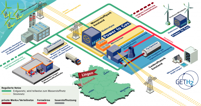 Wasserstoff und die Power-to-Gas-Technologie gelten als Schlüssel für eine gelingende Energiewende, denn gerade in den Sektoren Industrie, Verkehr und Wärme ist Wasserstoff als Bindeglied für die Dekarbonisierung relevant. Die Initiative „GET H2“ will mit einer bundesweiten Wasserstoffinfrastruktur einen Beitrag zum Erreichen der Klimaziele leisten. Unter Nutzung vorhandener Gasinfrastrukturen ein Wasserstoffnetz entstehen, über das zahlreiche Abnehmer mit erneuerbarem Wasserstoff versorgt werden können. Ausgangspunkt für ein bundesweites Netz ist ein erstes Wasserstoffteilnetz in Lingen.