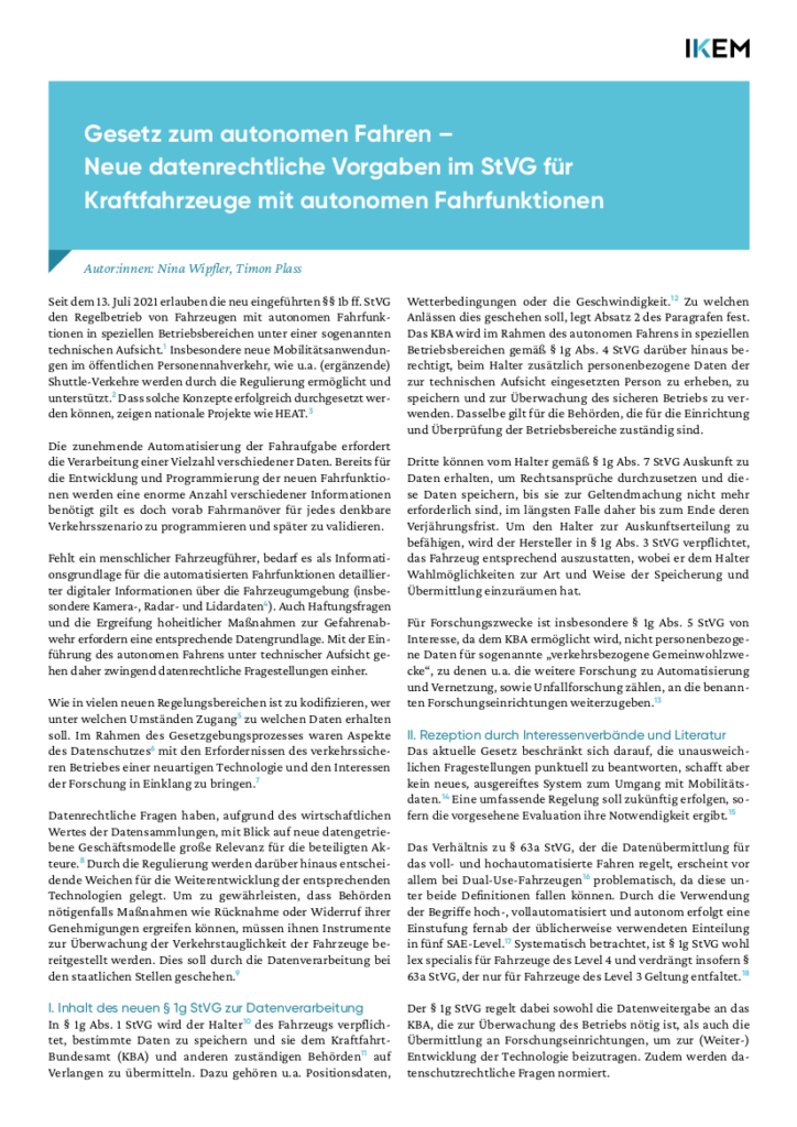 Gesetz zum autonomen Fahren – Neue datenrechtliche Vorgaben im StVG für Kraftfahrzeuge mit autonomen Fahrfunktionen