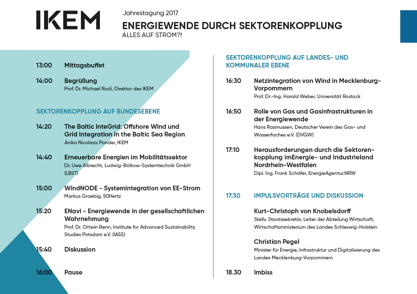 Ziel aller IKEM Jahrestagungen ist es, einen interdisziplinärer Überblick zu zentralen Forschungsfragen der Energie- und Mobilitätswende anzubieten und darüber in Gespräch zu kommen. Gelegenheit hiezu bestand beim gemeinsamen Abendessen im Anschluss an die Vorträge.  Zur Anregung der Diskussionen konnten wir Kurt-Christoph von Knobelsdorff, stellvertretender Staatssekretär beim Wirtschaftsministerium des Landes Schleswig-Holstein und Christian Pegel, Minister für Energie, Infrastruktur und Digitalisierung des Landes Mecklenburg-Vorpommern, für Grußworte gewinnen.