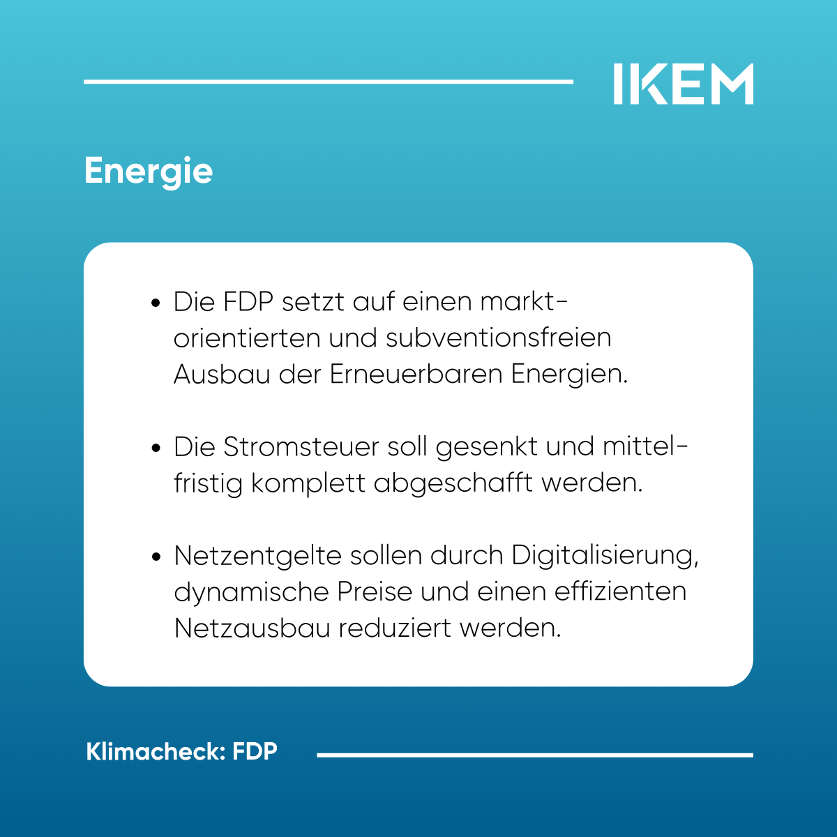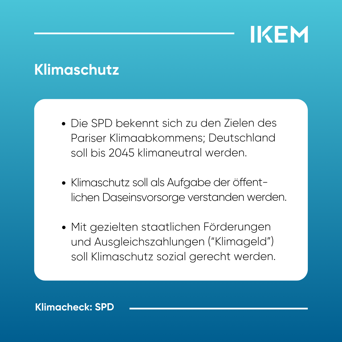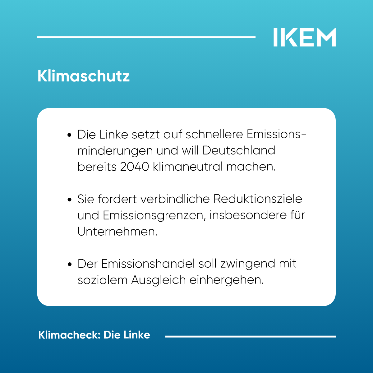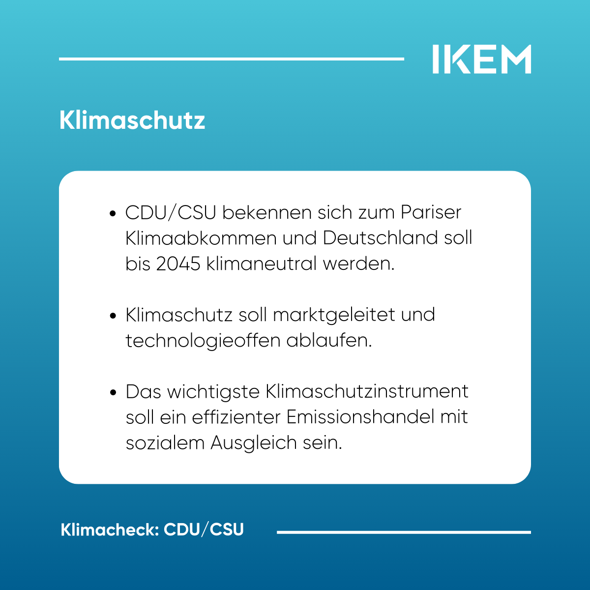 IKEM-Klimacheck https://www.ikem.de/klimacheck/ Thu, 06 Feb 2025 10:58:56 +0000 https://www.ikem.de/?p=32532 Am 23. Februar finden die Wahlen zum 21. Deutschen Bundestag statt. Von den 41 zugelassenen Parteien haben voraussichtlich sieben – CDU/CSU, SPD, Bündnis 90/Die Grünen, AfD, Die Linke, BSW sowie die FDP – Chancen, in den Bundestag einzuziehen. Angesichts nationaler, europäischer und internationaler Klimaschutzziele steht die künftige Bundesregierung vor weitreichenden klimapolitischen Herausforderungen. Der IKEM-Klimacheck analysiert […]