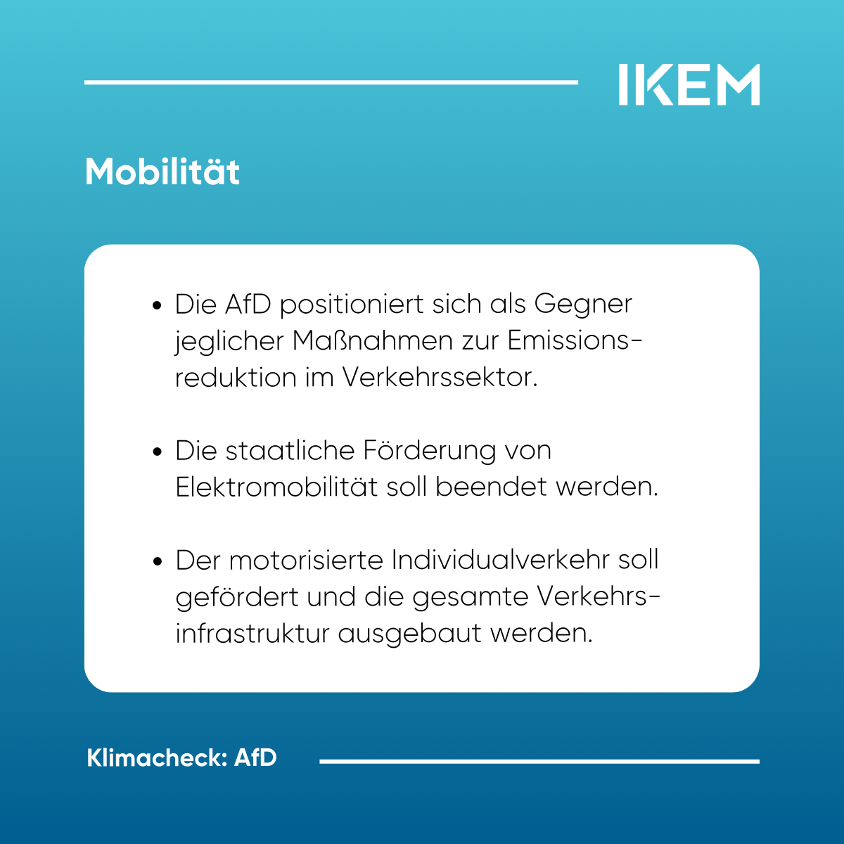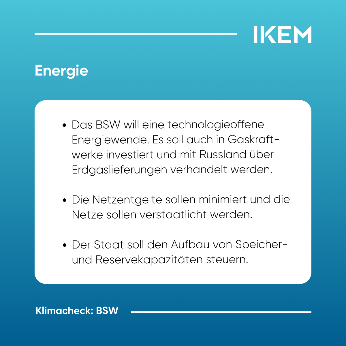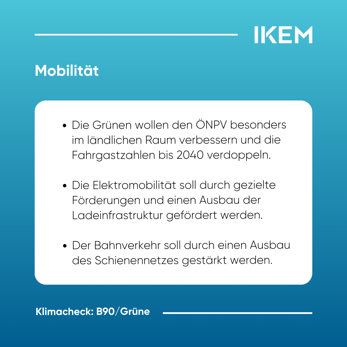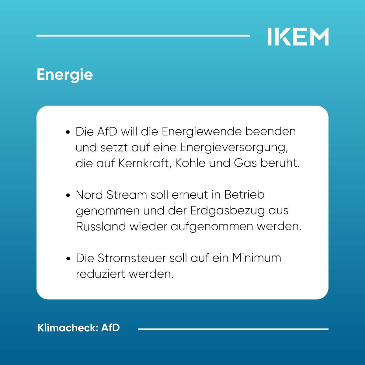 IKEM-Klimacheck https://www.ikem.de/klimacheck/ Thu, 06 Feb 2025 10:58:56 +0000 https://www.ikem.de/?p=32532 Am 23. Februar finden die Wahlen zum 21. Deutschen Bundestag statt. Von den 41 zugelassenen Parteien haben voraussichtlich sieben – CDU/CSU, SPD, Bündnis 90/Die Grünen, AfD, Die Linke, BSW sowie die FDP – Chancen, in den Bundestag einzuziehen. Angesichts nationaler, europäischer und internationaler Klimaschutzziele steht die künftige Bundesregierung vor weitreichenden klimapolitischen Herausforderungen. Der IKEM-Klimacheck analysiert […]