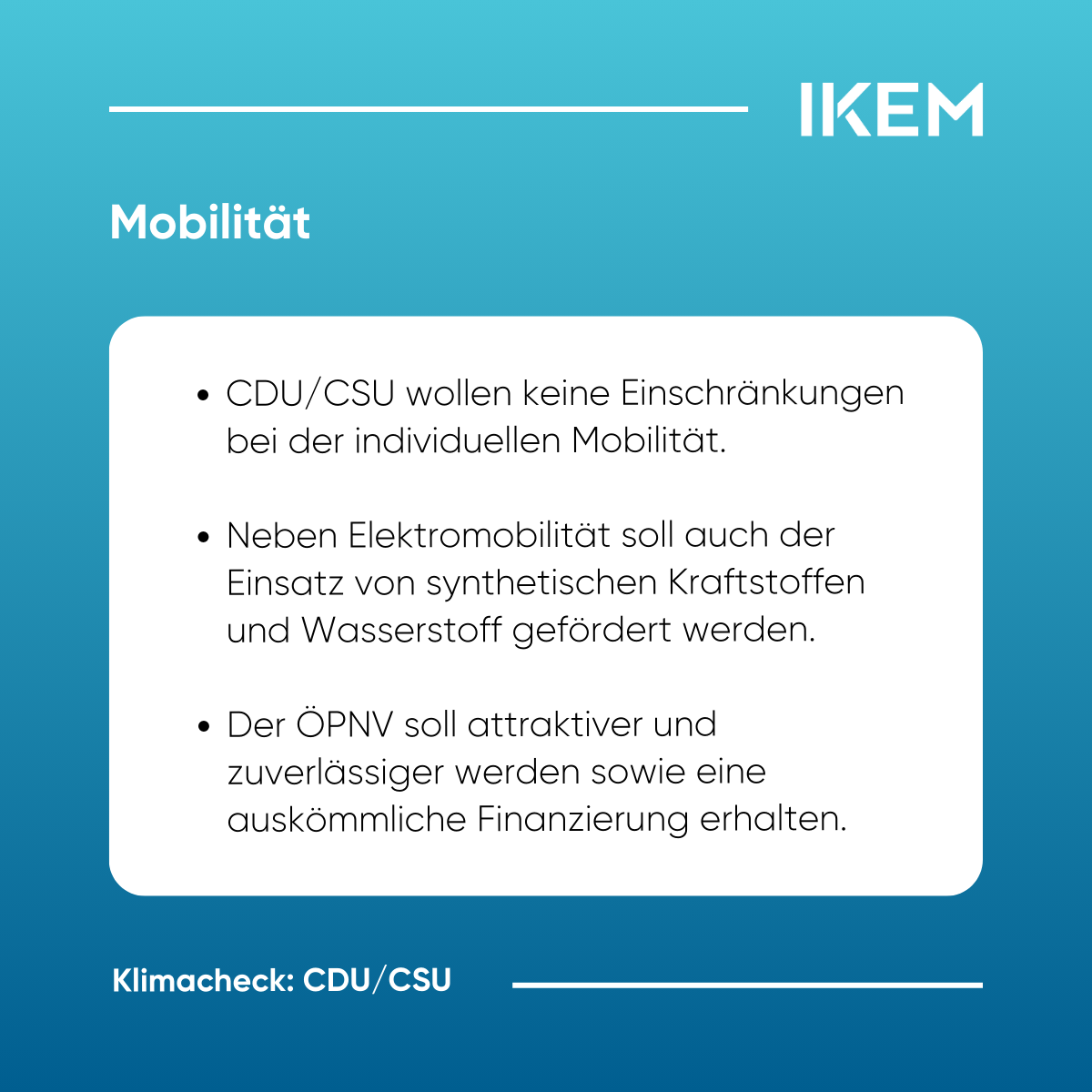 Unser Fazit: Der von CDU/CSU verfolgte Ansatz kann prinzipiell zum Ziel führen. Zu befürchten bleibt, dass der Klimaschutz zu langsam vorankommt. Im Verkehrssektor fehlt zudem ein klares Bekenntnis zu Maßnahmen, die über eine reine Emissionsreduktion hinausgehen.