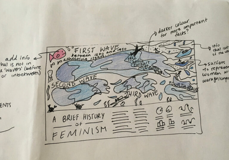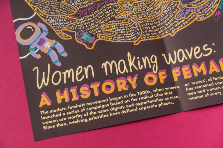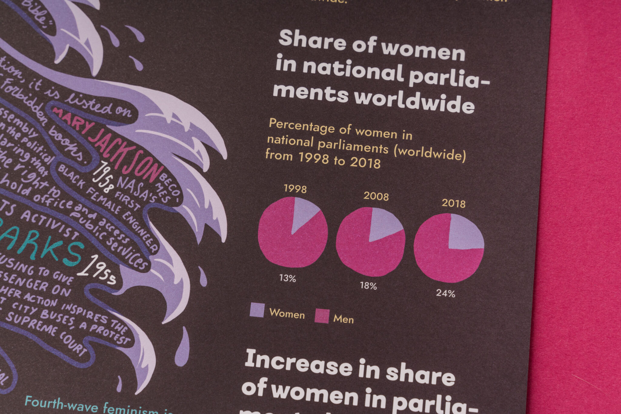 „Die Idee, ein Poster zu erstellen, entstand aus unseren Recherchen“, so Stabon, „denn wir fanden, dass es nicht genug Wissen gibt. Also recherchierten wir weiter, lasen über die Geschichte des Feminismus, sammelten Informationen über Frauen aus der Vergangenheit und beschlossen, dass wir ein Informationsblatt herausgeben könnten, das zeigt, wie all diese Frauen vor uns den Weg geebnet haben.