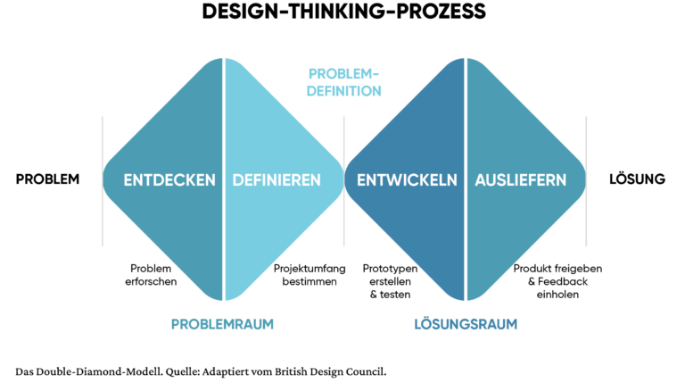 Die Design-Thinking-Methode blieb zunächst relativ konturlos, bis der British Design Council 2004 den Double-Diamond-Rahmen einführte, der den Prozess formalisierte. Der Rahmen stellt eine Art Landkarte für die Produktentwicklung dar und präsentiert die Methodik als eine Reihe von vier Schritten. Die Schritte werden als zwei nebeneinander liegende Rauten visualisiert, wobei die erste den „Problemraum“ und die zweite den „Lösungsraum“ darstellt.