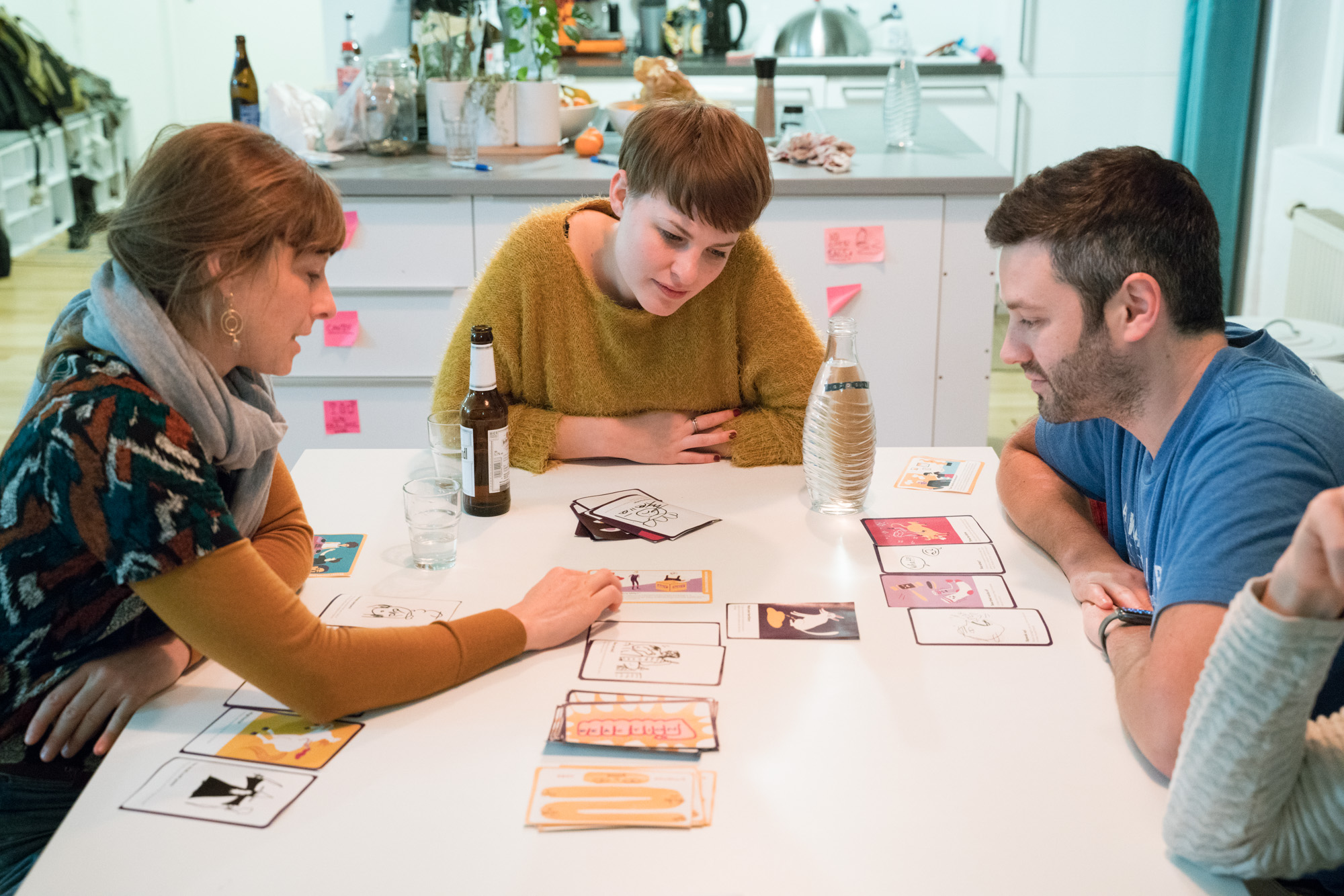 Quelle: IKEM Um das Spiel zu entwickeln, ging das Team die früheren Interviews durch, fasste jedes Szenario in ein paar Zeilen prägnanten Text zusammen und entwickelte einen Titel für jedes dieser Szenarien, der kreative Wortspiele enthielt. Nach der Erstellung von 50 dieser Situationskarten entwickelte das Team weitere 50 Reaktionskarten, fügte zwei Joker hinzu und illustrierte jede der 102 Karten im Stil eines bunten Comics.