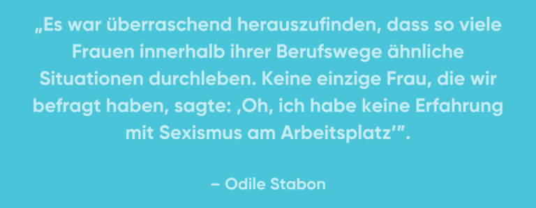 „Es war überraschend herauszufinden, dass so viele Frauen innerhalb ihrer Berufswege ähnliche Situationen durchleben“, so Stabon. „Keine einzige Frau, die wir befragt haben, sagte: ‘Oh, ich habe keine Erfahrung mit Sexismus am Arbeitsplatz'“.